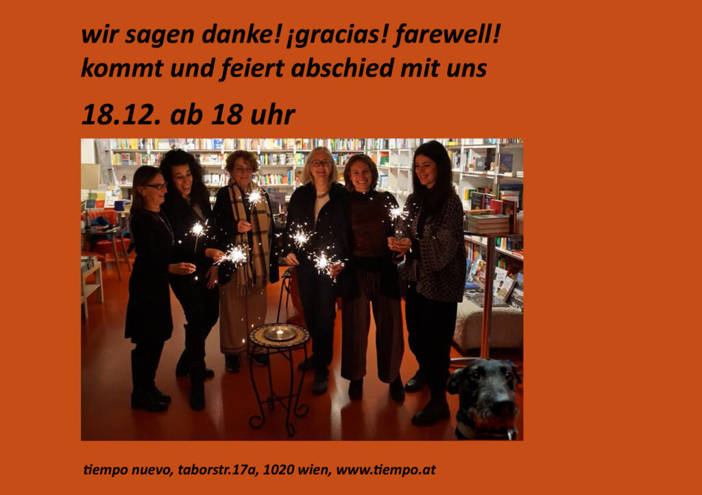 nach fast 30 jahren und mehreren hundert veranstaltungen ist es zeit, abschied zu nehmen von euch, liebe leser*innen, liebe kund*innen, autor*innen und allen, die im laufe der jahre zu freund*innen geworden sind. die buchhandlung tiempo nuevo schließt im jänner ihre pforten, aber vorher möchten wir mit euch abschied feiern: