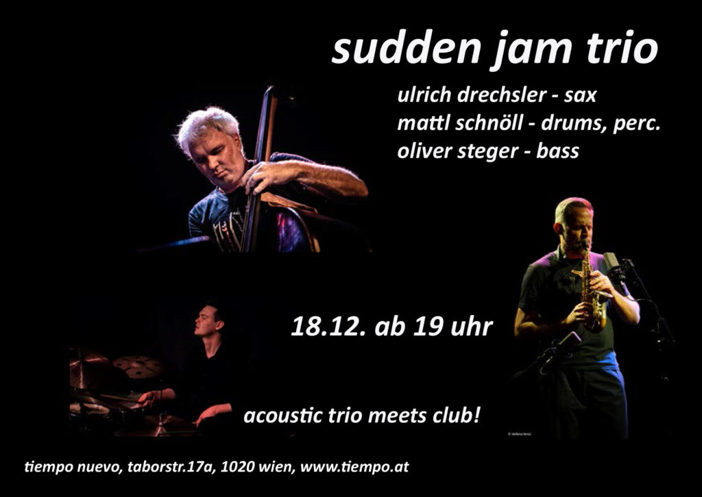 am donnerstag, den 18. dezember laden wir ab 18 uhr zur farewell-party mit tombola, drinks und live-musik. das sudden jam trio um ulrich drechsler (sax), oliver steger (b) und mattl schnöll (drums) wird uns mit drum & bass beats einheizen – acoustic meets club!